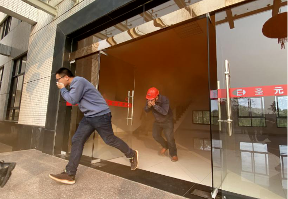 16點(diǎn)30分,用于演習(xí)的消防煙霧彈準(zhǔn)備停當(dāng);16點(diǎn)40分,中控室通過公共廣播系統(tǒng)發(fā)出消防警報(bào);聽到火災(zāi)警報(bào)后,各部門員工迅速有序地通過指定疏散路線撒離到綜合樓前空地。疏散逃生過程,樓梯及安全出口處均未出現(xiàn)堵塞、推擠現(xiàn)象,整個(gè)過程比較順暢。