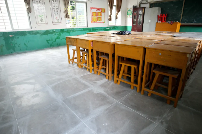 “看,這是教室和走廊原來的樣子,只有簡(jiǎn)單的水泥地面,再好一點(diǎn),就是部分教室鋪水磨磚?!表樦艠蛑袑W(xué)校長(zhǎng)陳祥鴻手指的方向,記者看到,教室、走廊、樓梯皆是粗糙的水泥地面,存在坑洼不平的現(xiàn)象。