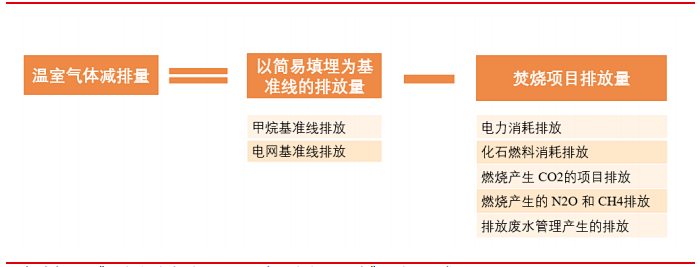 焚燒發(fā)電項目基準(zhǔn)線排放包括替代垃圾填埋產(chǎn)生的CH4排放以及替代火力發(fā)電相同電量產(chǎn)生的排放,共2個要素。