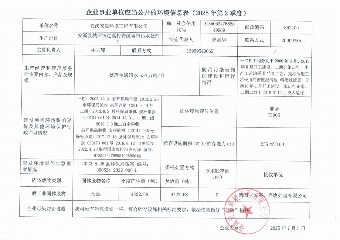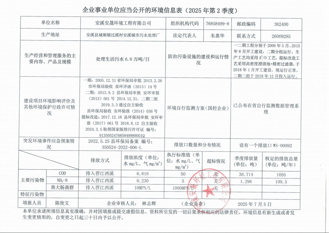 安溪城市污水處理廠2025年第2季度環(huán)境信息公開
