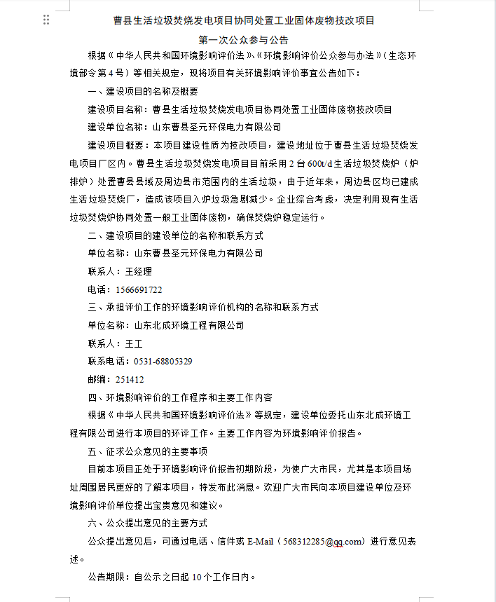 曹縣生活垃圾焚燒發(fā)電項(xiàng)目協(xié)同處置工業(yè)固體廢物技改項(xiàng)目 第一次公眾參與公告