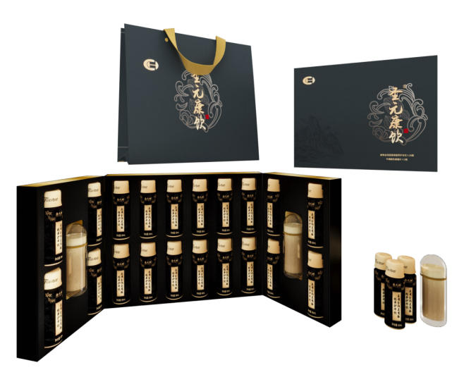 (1)圣元康飲黑金禮盒設計及供貨:該禮盒內裝20瓶蟲草?;撬犸嫞ㄆ孔訛殇X瓶,每瓶容量60ml)及2瓶?;撬崛樗峋?,供貨數量為6萬套。