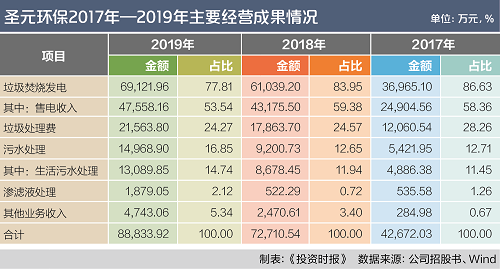 隨著經(jīng)營規(guī)模的不斷擴大,圣元環(huán)保經(jīng)營業(yè)績持續(xù)增長,盈利能力也不斷增強。2017年至2019年(下稱報告期),該公司營業(yè)收入分別實現(xiàn)4.27億元、7.27億元和8.88億元,處于逐年遞增的態(tài)勢,報告期主營業(yè)務(wù)收入復(fù)合增長率為40.85%。