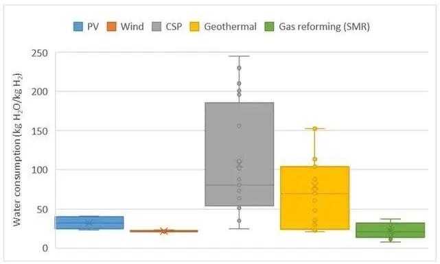 另一個組成部分是生產(chǎn)可再生電力和天然氣的水消耗。光伏發(fā)電的用水量在50-400升/MWh(2.4-19kgH2O/kgH2)之間變化,風(fēng)力發(fā)電的用水量在5-45升/MWh(0.2-2.1kgH2O/kgH2)之間。同樣,頁巖氣(根據(jù)美國數(shù)據(jù))的天然氣產(chǎn)量可以從1.14kgH2O/kgH2提高到4.9kgH2O/kgH2。