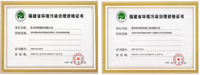 經(jīng)審核,圣元環(huán)保股份有限公司和泉州市圣澤環(huán)境工程有限公司的申報材料符合要求,運營管理規(guī)范,同意頒發(fā)《福建省環(huán)境污染治理設施運營資格證書》。